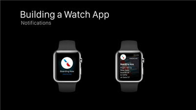 如果開(kāi)發(fā)者利用這兩個(gè)工具,他們能夠迅速顯示專(zhuān)門(mén)針對(duì)蘋(píng)果Watch小屏幕設(shè)計(jì)的通知信息。左圖中顯示的是用戶(hù)的航班正在接受旅客登機(jī)。如果用戶(hù)抬起胳膊,那么這種通知模式就會(huì)立即變成右圖中的Long Look模式,提供更為詳細(xì)的信息,例如登機(jī)門(mén)號(hào)和原定登機(jī)時(shí)間。